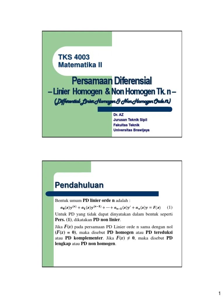 Persamaan diferensial homogen orde dua dengan koefisien konstanta. Pendhulun metode penyelesn persmn dferensl orde stu dn du yng telh dbhs. Persamaan diferensial linear orde dua dengan koefisien konstan. Persamaan diferensial biasa dengan koefisien linier. Persamaan diferensial orde n dikatakan linear.